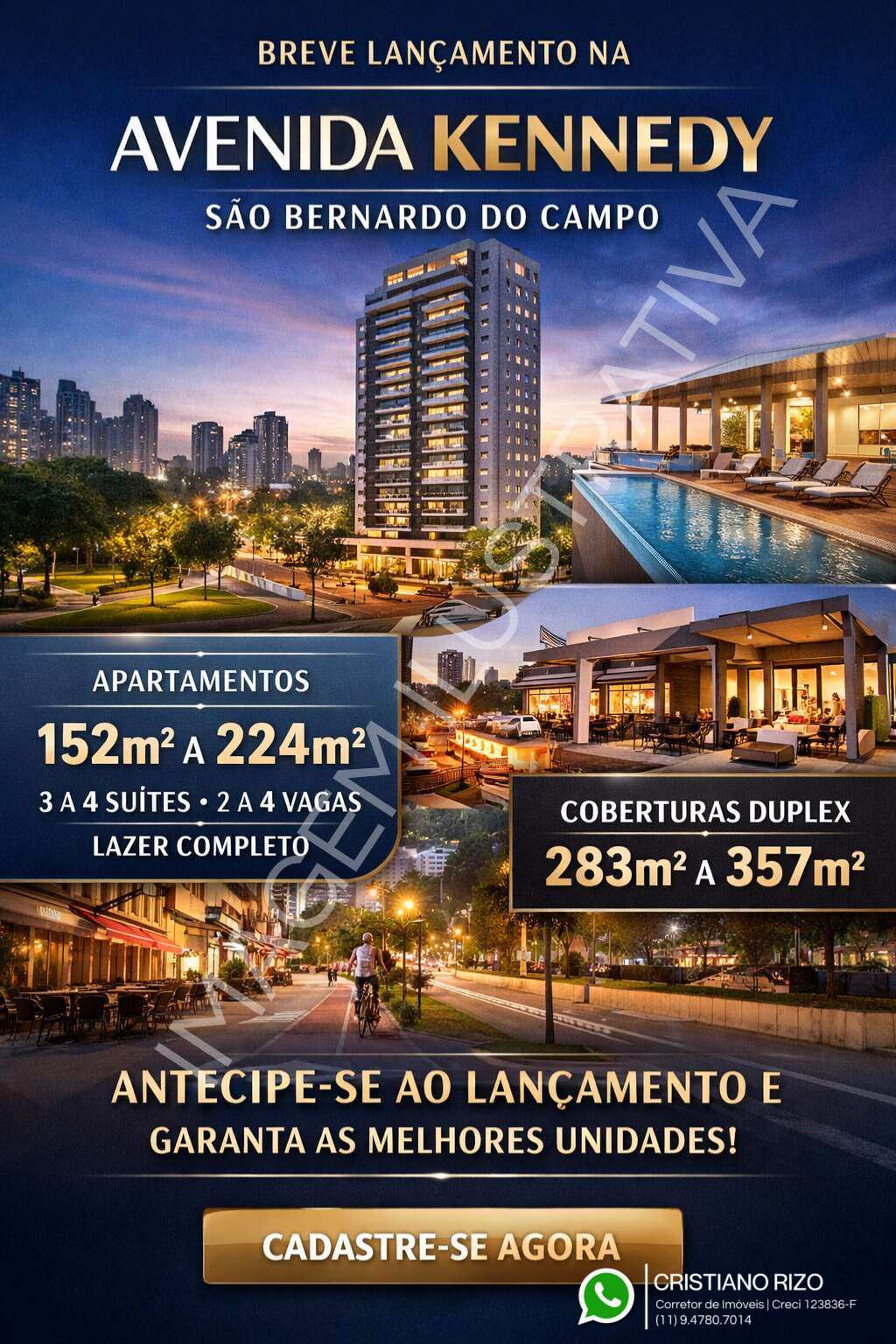 O projeto contará com apartamentos amplos de 152m² a 224m², com 3 ou 4 suítes, 2 a 4 vagas e lazer completo, além de coberturas duplex exclusivas de 283m² a 357m².